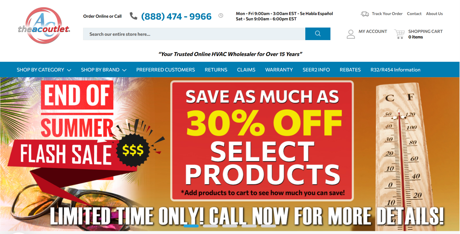 All products come with manufacturer warranties, some with lifetime coverage. The AC Outlet also offers extended labor warranty plans for additional protection. If perusing the online store is overwhelming, a sales representative can help you find the perfect unit. Unopened items are eligible for a 90% return within 30 days of purchase, and you are responsible for shipping fees. You must call customer service for a return authorization number first.